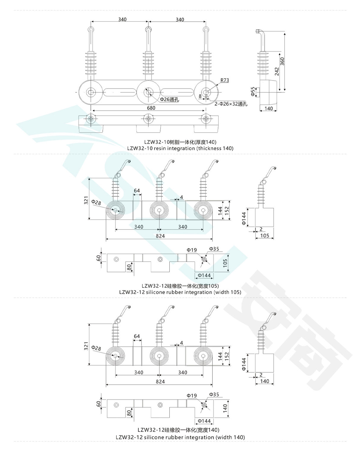 LJ-ZW32-10(12)系列零序保护一体式电流互感器是专用于ZW32开关上加以改进的新型产品,外绝缘采用抗紫外线抗老化的新型绝缘材料甲基乙烯基硅橡胶等绝缘压制而成,内部用环氧树脂灌封,固定二次保护绕组和零序绕组,可实现新的一、二次融合技术要求,三相保护线圈同时可兼顾0.5级的测量功能。零序线圈满足5%~120%时≤3级,500%时≤10%,并能满足12Um/V√3kV局放≤100pC的开关组合要求。并在三相与ZW32开关对接处加强绝缘,使耐压等级和雷电冲击都得以保证。一般保护三个变比,可实现不同变比的组合。